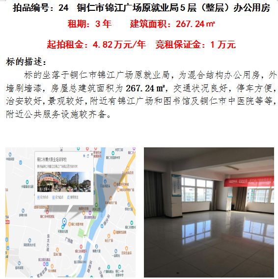5、銅仁市錦江廣場原就業(yè)局第五樓辦公用房3年租賃權(建筑面積:267.24㎡);起拍租金單價:4.82萬元/年;競租保證金:1萬元;