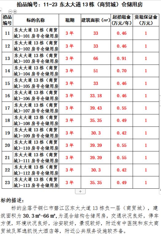 4、東太大道13棟(商貿城)倉儲(13間)3年租賃權(建筑面積30.3㎡-66㎡/間);起拍租金單價(每間):0.42萬元/年-0.91萬元/年;競租保證金(每間):1萬元;