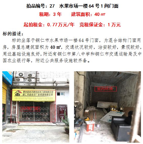 8、銅仁市水果市場一樓64號門面3年租賃權(建筑面積:40㎡);起拍租金單價:0.77萬元/年;競租保證金:1萬元;