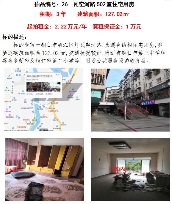 7、銅仁市碧江區(qū)瓦窯河路502室住宅用房3年租賃權(建筑面積:127.02㎡);起拍租金單價:2.22萬元/年;競租保證金:1萬元;