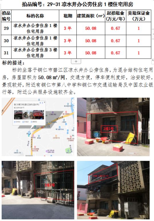 11、銅仁市碧江區(qū)涼水井辦公旁住宅用房三間3年租賃權(建筑面積:50.08㎡/間);起拍租金單價(間):0.67萬元/年;競租保證金:1萬元;