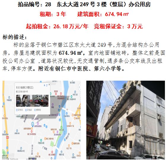 10、銅仁市碧江區(qū)東太大道249號辦公室3年租賃權(建筑面積:674.94㎡);起拍租金單價:26.18萬元/年;競租保證金:3萬元;