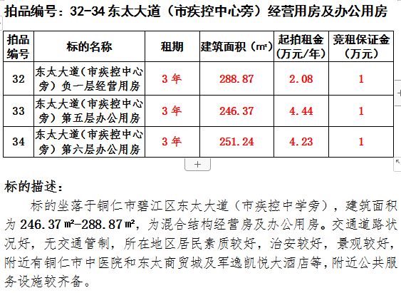 9、東太大道(市疾控中心旁)負一層(經營房)第五、六層(辦公用房)3年租賃權(建筑面積:246.37㎡-288.87㎡);起拍租金單價:2.08萬元/年-4.44萬元/年;競租保證金:1萬元;
